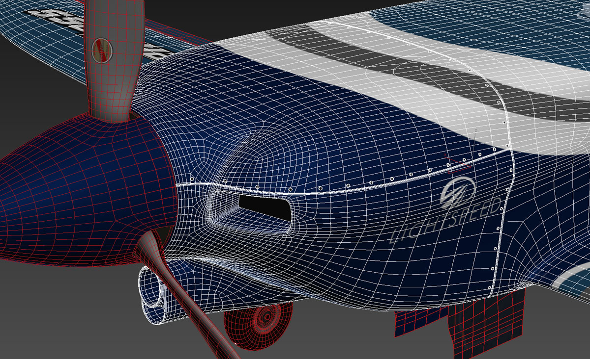 Der Kunde forderte ein Scale-Modell, welches sich maßgeblich am Original orientiert. Auf Details wie Servoschachtabdeckungen etc., die man sonst bei einem Modellflugzeug finden würde, wurde bewusst verzichtet. Das Modell besteht aus knapp 70.000 Dreiecken und kommt mit einer 4096x4096 Pixel großen Textur aus.
